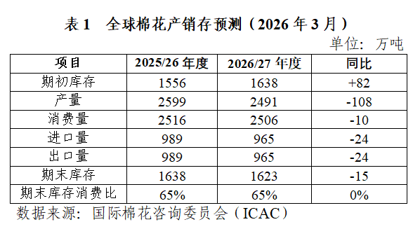 2025/26年度國(guó)內(nèi)棉花加工檢驗(yàn)進(jìn)入尾聲,截至3月26日,全國(guó)棉花累計(jì)檢驗(yàn)量760.6萬(wàn)噸,同比增長(zhǎng)12.3%;累計(jì)銷(xiāo)售率79.2%,同比提高17.5個(gè)百分點(diǎn),較過(guò)去四年均值提高20.9個(gè)百分點(diǎn)。國(guó)家發(fā)展改革委于3月16日宣布增發(fā)30萬(wàn)噸滑準(zhǔn)稅配額,有效補(bǔ)充紡織旺季企業(yè)對(duì)進(jìn)口棉的采購(gòu)需求。截至2月,2025/26年度我國(guó)進(jìn)口棉花87萬(wàn)噸,同比增長(zhǎng)約16%;進(jìn)口棉紗88萬(wàn)噸,同比增長(zhǎng)約24%。據(jù)此,本期中國(guó)棉花產(chǎn)銷(xiāo)存預(yù)測(cè)平衡表上調(diào)棉花消費(fèi)量和進(jìn)口量30萬(wàn)噸。國(guó)內(nèi)棉花進(jìn)入生產(chǎn)備播關(guān)鍵期,新疆縮減棉花種植面積的趨勢(shì)基本明確,新年度我國(guó)棉花產(chǎn)量下降預(yù)期較強(qiáng)。新一輪目標(biāo)價(jià)格政策即將公布,需高度關(guān)注政策實(shí)際調(diào)整方向。