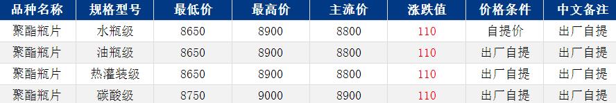 華東聚酯瓶片收于8800元/噸,漲跌值110元/噸,原油帶動原料繼續(xù)上行,聚酯瓶片重心跟漲。4月主流貨源報盤8650-8900元/噸,部分報盤8550-8600元/噸或期貨合約2605升水300-350,部分略低升水80;零星遞盤8600元/噸,業(yè)內觀望情緒濃厚,交投清淡。