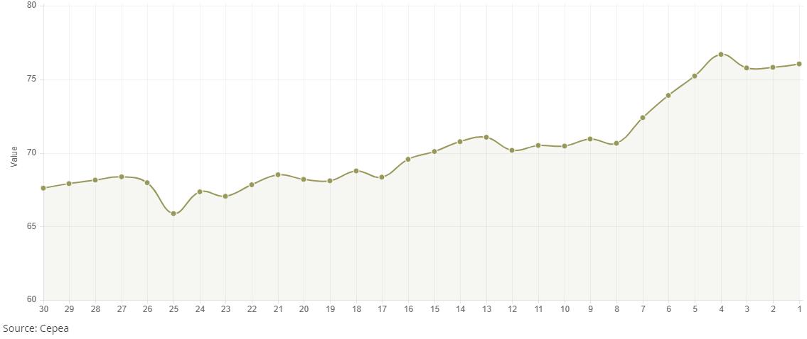 4月7日(周二),巴西CEPEA/ESALQ棉花價(jià)格指數(shù)報(bào)76.04美分/磅,較前一交易日上漲0.30%,較上月同期上漲1.09%。