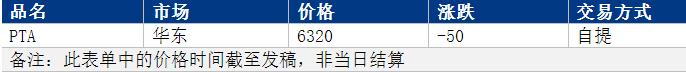 華東PTA價格弱勢盤整,商談參考6320元/噸附近。本周主港交割報盤05貼水15,遞盤偏少。需求端拖累市場買氣不佳,現(xiàn)貨市場偏弱整理,現(xiàn)貨基差小幅走弱,整體氣氛謹(jǐn)慎。