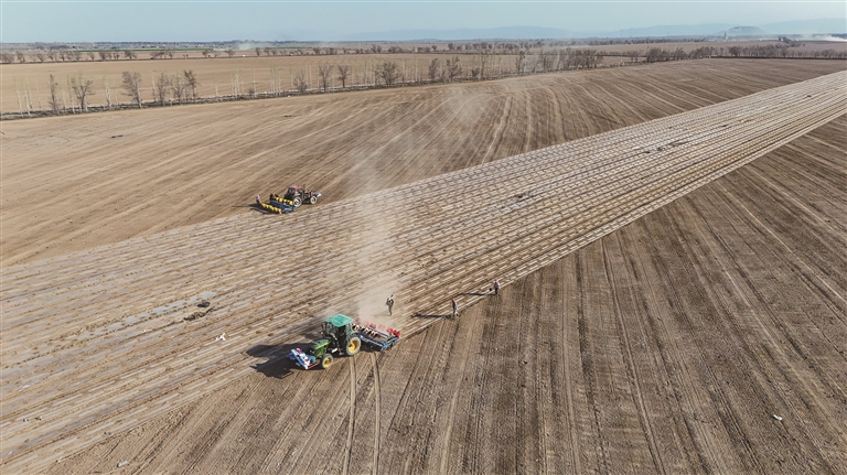 4月10日,呼圖壁縣五工臺鎮(zhèn)龍王廟村,農(nóng)機手搶抓晴好天氣,駕駛搭載北斗導(dǎo)航系統(tǒng)的精量播種機開展棉花播種作業(yè)。時下正值棉花播種關(guān)鍵期,當?shù)卦趶V泛應(yīng)用“先播種、后滴水”節(jié)水種植模式的基礎(chǔ)上,依托北斗導(dǎo)航系統(tǒng)實現(xiàn)高精度直線播種,有效確保播行筆直、下種均勻,為全年棉花豐產(chǎn)豐收打下堅實基礎(chǔ)。