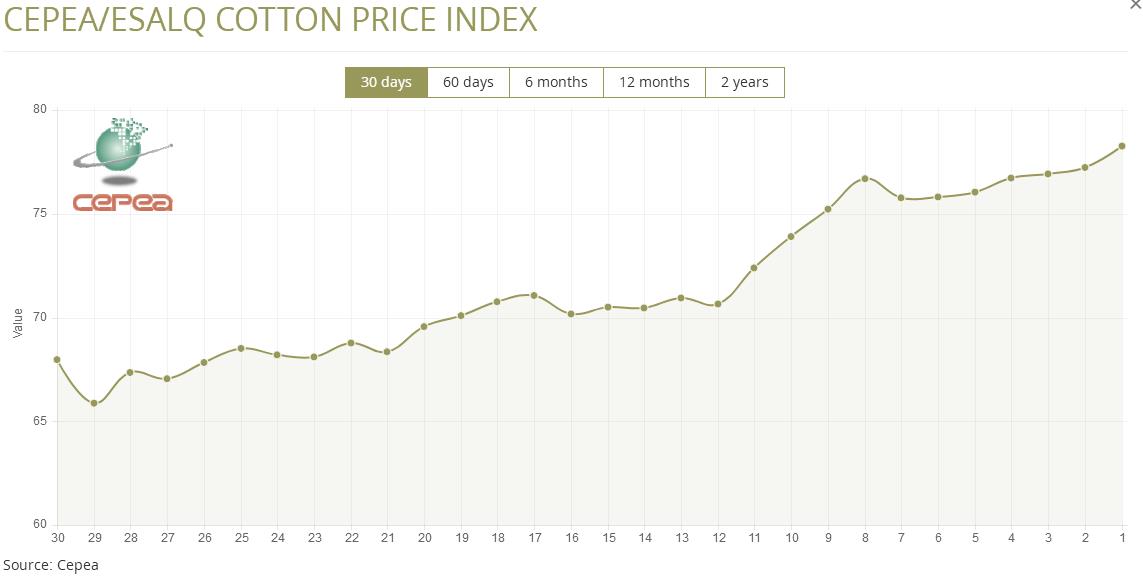 4月13日(周一),巴西CEPEA/ESALQ棉花價格指數(shù)報78.26美分/磅,較前一交易日上漲1.33%,較上月同期上漲4.04%。