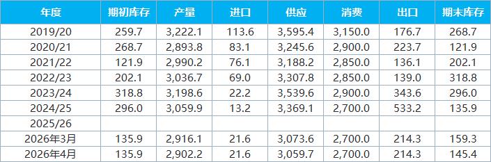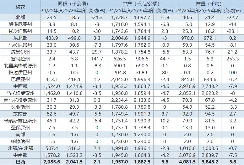 2025/26年度巴西棉花種植面積預(yù)估為204.15萬公頃,同比減少2.1%,上一年度為208.56萬公頃。