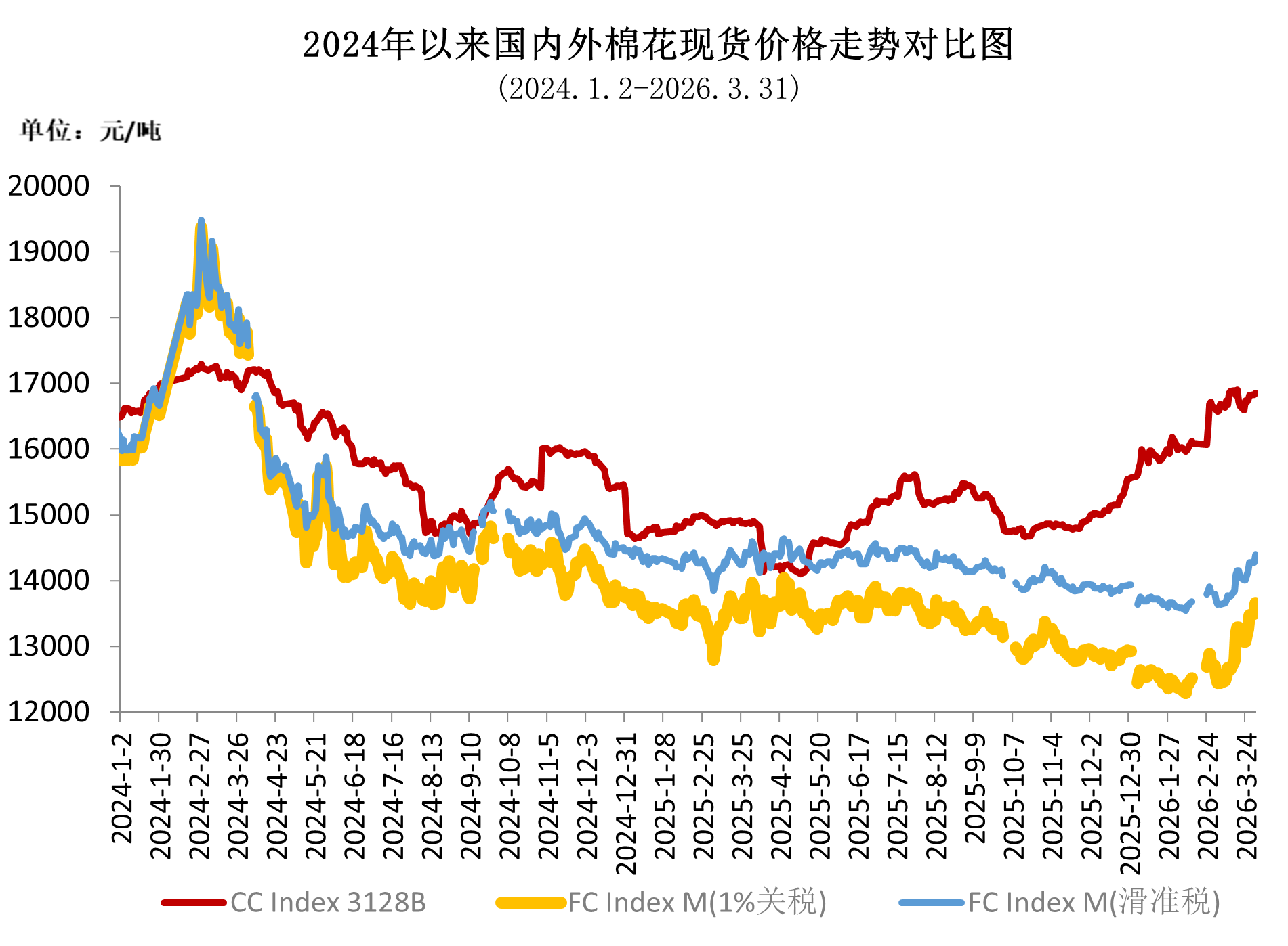受多重利多因素共振,3月國(guó)內(nèi)外棉價(jià)均上行。中東局勢(shì)升級(jí)推升國(guó)際油價(jià)、海運(yùn)費(fèi)用,導(dǎo)致化纖成本大幅攀升,對(duì)棉花的替代優(yōu)勢(shì)顯著削弱;同時(shí)化肥價(jià)格走高抬升棉花種植成本,為棉價(jià)提供成本支撐,中國(guó)棉花價(jià)格指數(shù)創(chuàng)近2年新高。月中有關(guān)部門(mén)增發(fā)滑準(zhǔn)稅配額,進(jìn)一步提振外棉走勢(shì),對(duì)國(guó)內(nèi)棉價(jià)則形成階段性抑制,內(nèi)外棉價(jià)差有所收窄,但仍維持高位運(yùn)行。