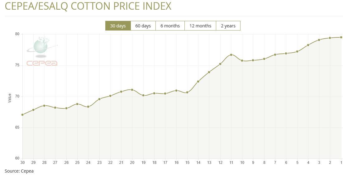 4月16日(周四),巴西CEPEA/ESALQ棉花價(jià)格指數(shù)報(bào)79.51美分/磅,較前一交易日上漲0.13%,較上月同期上漲5.70%。