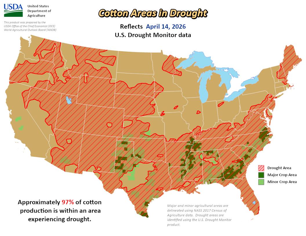 美國(guó)農(nóng)業(yè)部(USDA)下屬的首席經(jīng)濟(jì)學(xué)家辦公室(OCE)當(dāng)?shù)貢r(shí)間周四根據(jù)當(dāng)日發(fā)布的美國(guó)旱情監(jiān)測(cè)圖整理的美國(guó)農(nóng)業(yè)旱情文件顯示,截至4月14日當(dāng)周,約97%美棉產(chǎn)區(qū)受到干旱影響,前周為95%。