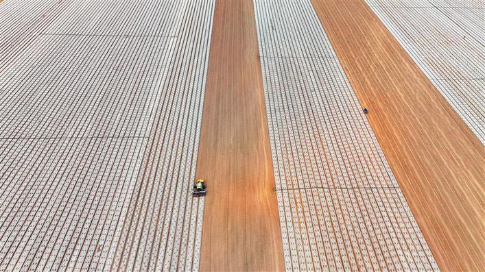 4月14日,在六師新湖農(nóng)場大田里,播種機進行棉花播種作業(yè)。今年,新湖農(nóng)場計劃種植棉花60余萬畝,目前已投入各類播種機械520臺(架),預計4月下旬完成播種任務,為實現(xiàn)“四月苗”目標奠定良好基礎。