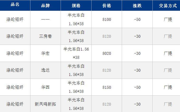 江蘇滌綸短纖現(xiàn)貨估價(jià)下跌50元至8100元/噸;早間短纖現(xiàn)貨商談參考8100-8150元/噸,偏低8000-8030元/噸。