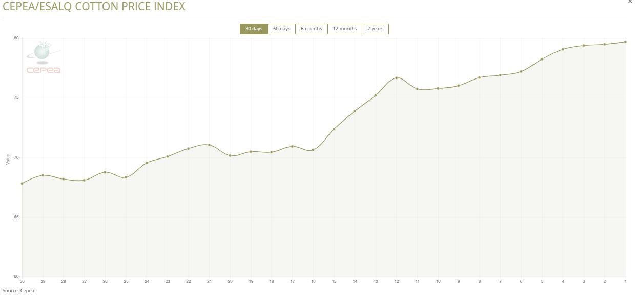 4月17日(周五),巴西CEPEA/ESALQ棉花價(jià)格指數(shù)報(bào)79.72美分/磅,較前一交易日上漲0.26%,較上月同期上漲5.98%。