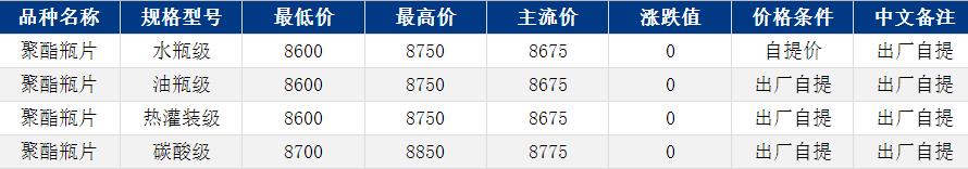 華東聚酯瓶片收于8675元/噸,漲跌值0元/噸,原料區(qū)間震蕩,支撐一般,聚酯瓶片工廠集體報穩(wěn),重心僵持整理。4月主流貨源報盤8600-8750元/噸或2606升水450-600,略低在8430-8500元/噸或2605升水150。零星遞盤8600元/噸,交投清淡。