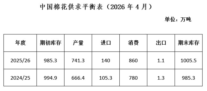 美國(guó)農(nóng)業(yè)部(USDA)4月供需報(bào)告顯示,2025/26年度全球棉花產(chǎn)量上調(diào)至2653.5萬噸,為近5年高位,消費(fèi)量調(diào)增至2593.9萬噸,保持在近5年度次高水平,期末庫(kù)存相應(yīng)增至1677.4萬噸。