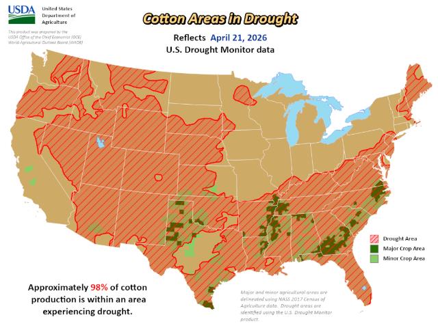 美國農業(yè)部(USDA)下屬的首席經濟學家辦公室(OCE)當地時間周四根據當日發(fā)布的美國旱情監(jiān)測圖整理的美國農業(yè)旱情文件顯示,截至4月21日當周,約98%美棉產區(qū)受到干旱影響,前周為97%。