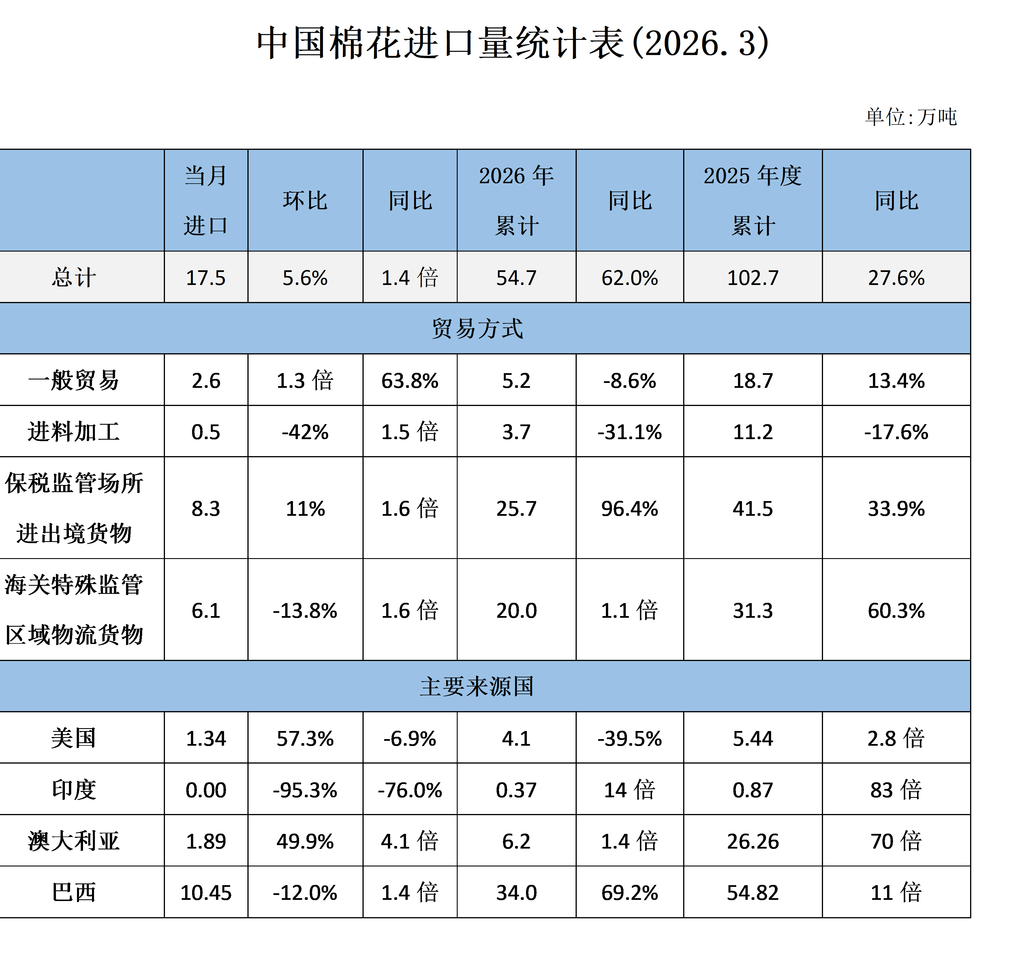 2026年3月,國(guó)內(nèi)用棉需求因紡織旺季而增加,同時(shí)內(nèi)外棉價(jià)差維持高位,企業(yè)加大外棉采購(gòu)力度,加上國(guó)家增發(fā)30萬(wàn)噸滑準(zhǔn)稅進(jìn)口配額,多因素推動(dòng)棉花進(jìn)口量延續(xù)1-2月的增長(zhǎng)態(tài)勢(shì),同比大幅攀升。進(jìn)口來(lái)源國(guó)中,巴西棉依舊穩(wěn)居首位,澳棉進(jìn)口占比穩(wěn)步提升。受?chē)?guó)際棉價(jià)震蕩上行影響,當(dāng)月進(jìn)口棉均價(jià)環(huán)比小幅上漲。