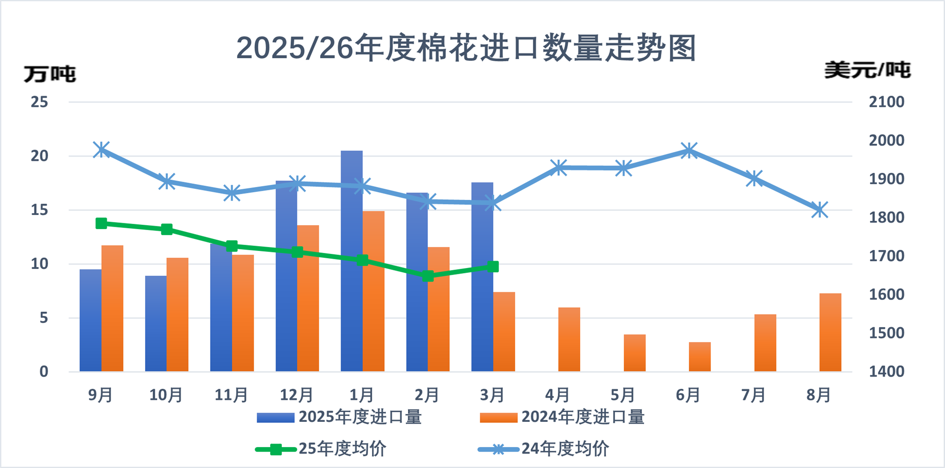 據(jù)海關(guān)數(shù)據(jù),3月我國(guó)進(jìn)口棉花17.5萬(wàn)噸,環(huán)比增長(zhǎng)5.6%,同比增長(zhǎng)1.4倍。2026年前3個(gè)月進(jìn)口棉花54.7萬(wàn)噸,同比增長(zhǎng)62%。2025/26年度前7個(gè)月進(jìn)口棉花102.7萬(wàn)噸,同比增長(zhǎng)27.6%。本月進(jìn)口環(huán)比小幅回升,一方面是因各主產(chǎn)棉國(guó)貨源供應(yīng)充足、外棉價(jià)格仍具優(yōu)勢(shì),另一方面下游紡織訂單回暖,企業(yè)持續(xù)性補(bǔ)庫(kù)需求釋放。