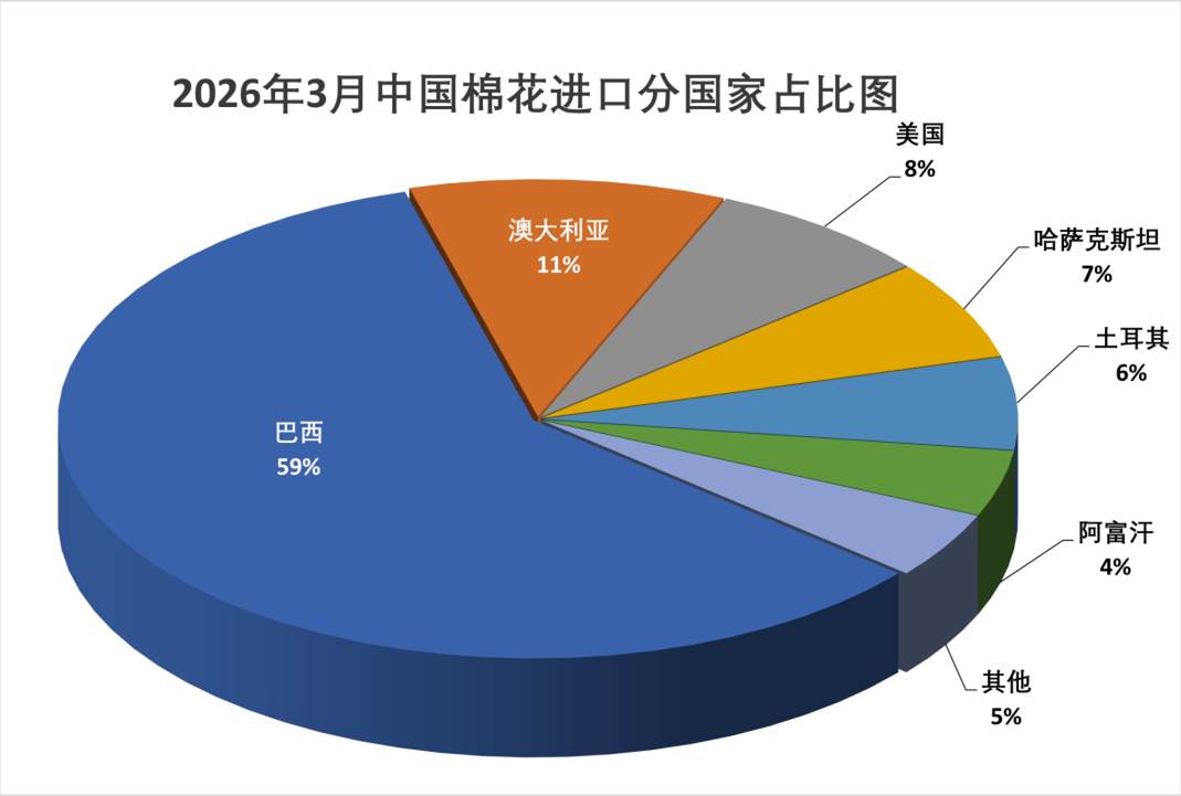 3月我國(guó)進(jìn)口棉花來(lái)源地仍以巴西棉、澳棉為主,巴西繼續(xù)為我國(guó)進(jìn)口棉花的第一大來(lái)源地,占比達(dá)到59%,主要得益于巴西棉在價(jià)格上的性?xún)r(jià)比優(yōu)勢(shì),我國(guó)企業(yè)持續(xù)加大采購(gòu)力度;澳棉因品質(zhì)優(yōu)勢(shì)適配高端紡紗需求,而高支紗銷(xiāo)售持續(xù)向好,受到紡織廠青睞,占比環(huán)比增加3個(gè)百分點(diǎn)至11%;美國(guó)占比為8%、哈薩克斯坦占比為7%、土耳其占比為6%。