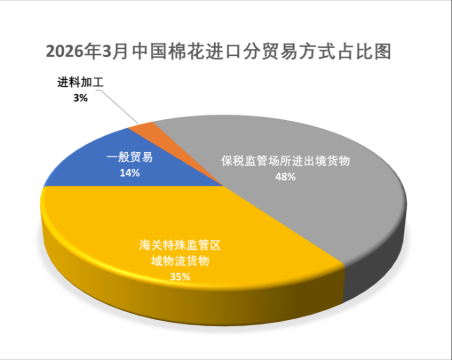 3月棉花進(jìn)口貿(mào)易方式中,保稅監(jiān)管場(chǎng)所進(jìn)出境貨物方式占比最高,達(dá)48%,環(huán)比上升3個(gè)百分點(diǎn);海關(guān)特殊監(jiān)管區(qū)域物流貨物占比35%,環(huán)比下降8個(gè)百分點(diǎn);一般貿(mào)易占比14%,環(huán)比上升7個(gè)百分點(diǎn);進(jìn)料加工貿(mào)易占比3%,環(huán)比回落2個(gè)百分點(diǎn)。
