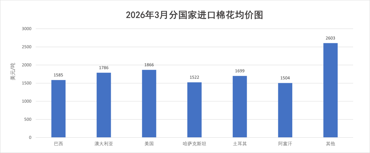 3月,受中東地緣推升海運(yùn)成本、國(guó)內(nèi)新增配額提振采購(gòu)需求影響,國(guó)際棉價(jià)震蕩走高,我國(guó)棉花進(jìn)口月均價(jià)1673美元/噸,環(huán)比上漲1.5%,同比下跌9%。主要來(lái)源國(guó)中,巴西棉均價(jià)1585美元,環(huán)比下跌1.35%,同比下跌11.7%;澳大利亞棉均價(jià)1786美元/噸,環(huán)比上漲2.3%,同比下跌7%;美棉均價(jià)1866美元/噸,環(huán)比上漲6.4%,同比下跌3.2%。