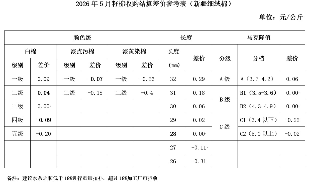 根據(jù)《中國棉花協(xié)會籽棉收購結(jié)算差價參考表(新疆細絨棉)管理辦法》規(guī)定,現(xiàn)正式發(fā)布2026年5月《籽棉收購結(jié)算差價參考表(新疆細絨棉)》(單位:元/公斤),為新疆地區(qū)籽棉收購提供參考。