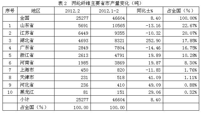 全國丙綸纖維2012年1-2月份產(chǎn)量合計(jì)為4.66萬噸,比上年同期增加8.40%;其中產(chǎn)量最大的省市是山東省,產(chǎn)量為1.06萬噸,為省市龍頭;其次是江蘇省,產(chǎn)量0.94萬噸,位居亞軍;然后是湖北省,產(chǎn)量0.83萬噸,榮立第三;廣東省0.78萬噸,為第四;浙江省0.48萬噸,占第五;河南省0.39萬噸,位居第六;接下來是上海市0.08萬噸,為第七;天津市0.05萬噸,占第八;河北省0.04萬噸,位居第九;黑龍江0.02萬噸,為第十名;上述10大省市2012年1-2月份產(chǎn)量合計(jì)為4.66萬噸,占全國2012年1-2月份總產(chǎn)量的100.00%。