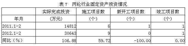 據(jù)國家統(tǒng)計(jì)局公布的數(shù)據(jù),2012年1-2月份丙綸行業(yè)實(shí)際完成投資額3.06億元,同比增加106.88%;當(dāng)年以來到目前為止施工項(xiàng)目總數(shù)為9個,同比增加59.72%;其中新開工項(xiàng)目數(shù)0個,同比減少100.00%;截至2月底為止,已實(shí)現(xiàn)竣工項(xiàng)目數(shù)1個,同比增加0.00%,占施工項(xiàng)目總數(shù)的11.11%,表明該行業(yè)投資項(xiàng)目進(jìn)展較好。
