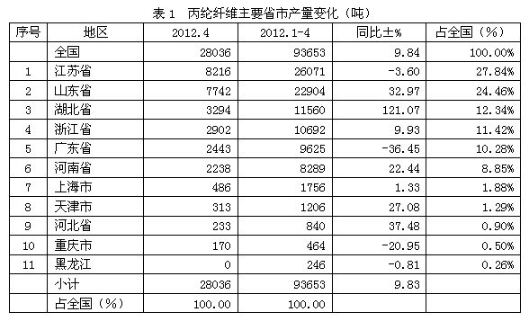 全國(guó)丙綸纖維2012年1-4月份產(chǎn)量合計(jì)為9.37萬(wàn)噸,比上年同期增加9.84%;其中產(chǎn)量最大的省市是江蘇省,產(chǎn)量為2.61萬(wàn)噸,為省市龍頭;其次是山東省,產(chǎn)量2.29萬(wàn)噸,位居亞軍;然后是湖北省,產(chǎn)量1.16萬(wàn)噸,榮立第三;浙江省1.07萬(wàn)噸,為第四;廣東省0.96萬(wàn)噸,占第五;河南省0.83萬(wàn)噸,位居第六;接下來(lái)是上海市0.18萬(wàn)噸,為第七;天津市0.12萬(wàn)噸,占第八;河北省0.08萬(wàn)噸,位居第九;重慶市0.05萬(wàn)噸,為第十名;黑龍江0.02萬(wàn)噸,居第11名;上述11大省市2012年1-4月份產(chǎn)量合計(jì)為9.37萬(wàn)噸,占全國(guó)2012年1-4月份總產(chǎn)量的100.00%。
