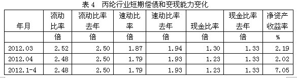 從短期償債和變現(xiàn)能力的變化看,丙綸行業(yè)流動(dòng)比率(流動(dòng)資產(chǎn)/流動(dòng)負(fù)債)2012年1-4月份為2.48倍,而上年同期為2.50倍,流動(dòng)比率較高,表明企業(yè)短期償債能力較強(qiáng);