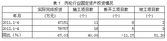 據(jù)國(guó)家統(tǒng)計(jì)局公布的數(shù)據(jù),2012年1-4月份丙綸行業(yè)實(shí)際完成投資額7.88億元,同比增加67.03%;當(dāng)年以來(lái)到目前為止施工項(xiàng)目總數(shù)為16個(gè),同比增加40.00%;其中新開(kāi)工項(xiàng)目數(shù)5個(gè),同比減少11.27%;截至4月底為止,已實(shí)現(xiàn)竣工項(xiàng)目數(shù)3個(gè),同比增加51.20%,占施工項(xiàng)目總數(shù)的18.75%,表明該行業(yè)投資項(xiàng)目進(jìn)展較好。