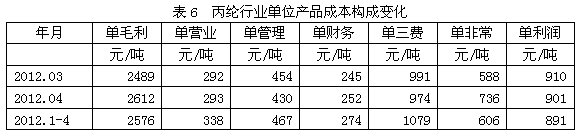 從單位產(chǎn)品成本構(gòu)成變化情況看,2012年1-4月份我國(guó)丙綸行業(yè)中相對(duì)于每噸丙綸產(chǎn)量而言,其單毛利為2576元/噸,單營(yíng)業(yè)(單位產(chǎn)品的營(yíng)業(yè)費(fèi)用)為338元/噸,單管理(單位產(chǎn)品的管理費(fèi)用)為467元/噸,單財(cái)務(wù)(單位產(chǎn)品的財(cái)務(wù)費(fèi)用)為274元/噸,單三費(fèi)為1079元/噸,單非常(單位產(chǎn)品的非經(jīng)常性損益)為606元/噸,單利潤(rùn)(稅前利潤(rùn))為891元/噸,如果剔除非經(jīng)常性損益的影響,單位產(chǎn)品的名義稅前利潤(rùn)為1497元/噸。