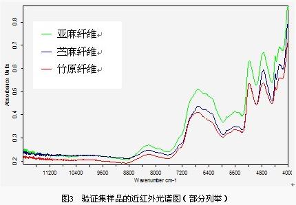 竹原纖維作為一種可再生、可降解、廉價(jià)、資源豐富的纖維素纖維,因具有良好的理化性能,近年來受到了越來越多人的青睞[1-4]。然而,由于竹原纖維與苧麻、亞麻具有極其相似的形態(tài)結(jié)構(gòu)或理化性質(zhì),竹原纖維與苧麻、亞麻的有效鑒別成為當(dāng)前研究的難題,至今尚未有鑒別方法的統(tǒng)一標(biāo)準(zhǔn)[5-6]。當(dāng)前,針對(duì)竹原纖維的鑒別,人們采用一些常規(guī)檢測(cè)方法進(jìn)行了探索研究,但在適用性和有效性上仍有欠缺[7-10]。本文廣泛收集國(guó)內(nèi)主要生產(chǎn)廠家生產(chǎn)的竹原纖維、苧麻和亞麻,應(yīng)用近紅外聚類分析方法,實(shí)現(xiàn)了對(duì)竹原纖維和苧麻、亞麻的鑒別。