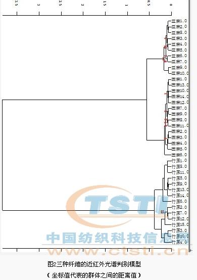 根據(jù)光譜預(yù)處理后的各纖維建模集樣品的近紅外光譜全譜數(shù)據(jù)圖,使用系統(tǒng)聚類分析方法,建立三種纖維的近紅外光譜判別模型,如圖2所示。根據(jù)判別模型可以明顯區(qū)別三種纖維,從而實(shí)現(xiàn)纖維的鑒別。