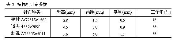 梳棉工序的主要目的是在盡量減少纖維損傷的基礎(chǔ)上,有效分梳纖維,提高單纖維的分離度和伸直平行度,減少棉結(jié)雜質(zhì),從而降低成紗的條干CV值、棉結(jié)和細(xì)紗的斷頭,丙綸采用低速弱分梳,棕彩棉采用低速?gòu)?qiáng)分梳。梳棉工序的難點(diǎn),在于丙綸生產(chǎn)時(shí),繞錫林嚴(yán)重,棉網(wǎng)向道夫轉(zhuǎn)移困難,采取了以下措施:降低道夫速度;提高清花、梳棉的相對(duì)濕度為62%;配置大工作角度的針布(針布規(guī)格型號(hào)見(jiàn)表2)。