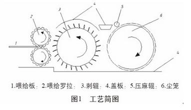 制樣機的工藝簡圖如圖1所示。精干麻切斷成一定的長度,人工將一定量的切斷麻均勻地平鋪在喂給板1上,精干麻由一對溝槽羅拉2積極握持,上溝槽羅拉由彈簧加壓與下溝槽羅拉嚙合,因而能牢牢地握持住精干麻,并以溝槽羅拉的線速度向刺輥3喂入。刺輥的表面包覆著針布,刺輥表面的線速度遠遠超過喂給羅拉的線速度,送入的精干麻受到高速回轉(zhuǎn)且轉(zhuǎn)動慣量很大的刺輥的開松梳理,大部分的束絲、并絲被分離成單纖維的狀態(tài)。經(jīng)開松、梳理過的纖維在塵籠6的負壓作用下吸附在其表面上,塵籠在電動機的帶動作用下轉(zhuǎn)動輸出纖維網(wǎng)。