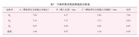 由表5的極差分析可知,喂給羅拉與刺輥之間速比、喂給羅拉與刺輥之間隔距對苧麻開松效果影響程度都比較大。影響程度依次為:喂給羅拉與刺輥之間速比>喂給羅拉與刺輥之間隔距>喂入長度。最優(yōu)工藝參數(shù)為A1C2B2?! ?/p>