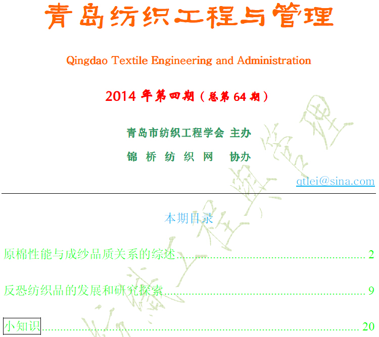 由青島市紡織工程學(xué)會主辦、錦橋紡織網(wǎng)協(xié)辦的《青島紡織工程與管理》電子期刊于2009年1月正式創(chuàng)刊。該刊由青島市紡織工程學(xué)會秦志強工程師任主編。該刊除以電子郵件形式發(fā)送至?xí)T單位外,還在錦橋紡織網(wǎng)開設(shè)專門窗口供業(yè)內(nèi)人士進行瀏覽與查閱。該刊的創(chuàng)辦定能為廣大紡織業(yè)技術(shù)人員提供1個技術(shù)交流平臺,為我國紡織業(yè)技術(shù)創(chuàng)新起到積極作用。