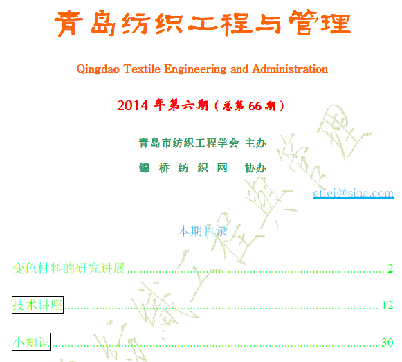 由青島市紡織工程學(xué)會主辦、錦橋紡織網(wǎng)協(xié)辦的《青島紡織工程與管理》電子期刊于2009年1月正式創(chuàng)刊。該刊由青島市紡織工程學(xué)會秦志強(qiáng)工程師任主編。該刊除以電子郵件形式發(fā)送至?xí)T單位外,還在錦橋紡織網(wǎng)開設(shè)專門窗口供業(yè)內(nèi)人士進(jìn)行瀏覽與查閱。該刊的創(chuàng)辦定能為廣大紡織業(yè)技術(shù)人員提供1個技術(shù)交流平臺,為我國紡織業(yè)技術(shù)創(chuàng)新起到積極作用。