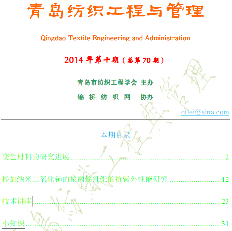由青島市紡織工程學(xué)會(huì)主辦、錦橋紡織網(wǎng)協(xié)辦的《青島紡織工程與管理》電子期刊于2009年1月正式創(chuàng)刊。該刊由青島市紡織工程學(xué)會(huì)秦志強(qiáng)工程師任主編。該刊除以電子郵件形式發(fā)送至?xí)T單位外,還在錦橋紡織網(wǎng)開(kāi)設(shè)專(zhuān)門(mén)窗口供業(yè)內(nèi)人士進(jìn)行瀏覽與查閱。該刊的創(chuàng)辦定能為廣大紡織業(yè)技術(shù)人員提供1個(gè)技術(shù)交流平臺(tái),為我國(guó)紡織業(yè)技術(shù)創(chuàng)新起到積極作用。