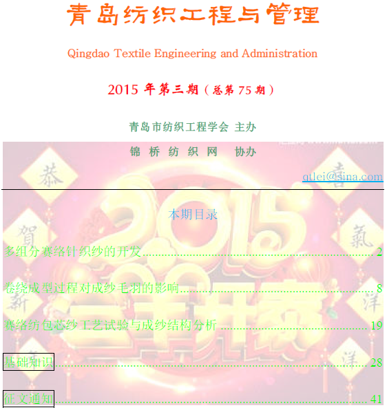 由青島市紡織工程學會主辦、錦橋紡織網(wǎng)協(xié)辦的《青島紡織工程與管理》電子期刊于2009年1月正式創(chuàng)刊。該刊由青島市紡織工程學會秦志強工程師任主編。該刊除以電子郵件形式發(fā)送至會員單位外,還在錦橋紡織網(wǎng)開設專門窗口供業(yè)內(nèi)人士進行瀏覽與查閱。該刊的創(chuàng)辦定能為廣大紡織業(yè)技術人員提供1個技術交流平臺,為我國紡織業(yè)技術創(chuàng)新起到積極作用。