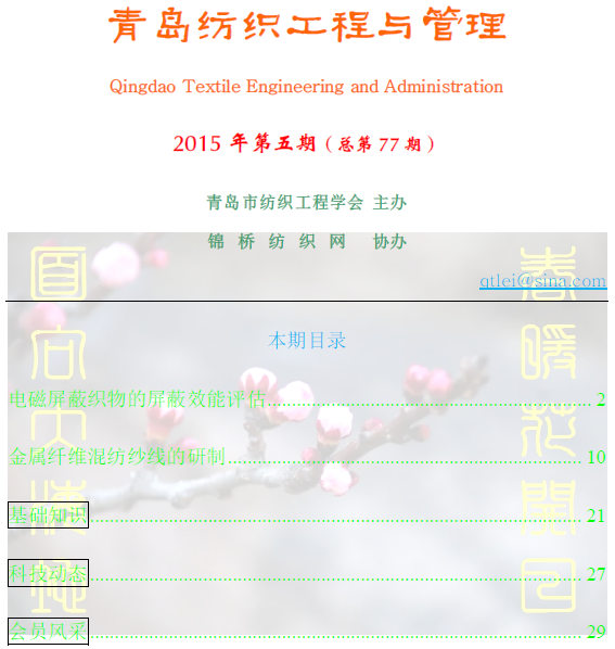 由青島市紡織工程學(xué)會(huì)主辦、錦橋紡織網(wǎng)協(xié)辦的《青島紡織工程與管理》電子期刊于2009年1月正式創(chuàng)刊。該刊由青島市紡織工程學(xué)會(huì)秦志強(qiáng)工程師任主編。該刊除以電子郵件形式發(fā)送至?xí)T單位外,還在錦橋紡織網(wǎng)開設(shè)專門窗口供業(yè)內(nèi)人士進(jìn)行瀏覽與查閱。該刊的創(chuàng)辦定能為廣大紡織業(yè)技術(shù)人員提供1個(gè)技術(shù)交流平臺(tái),為我國(guó)紡織業(yè)技術(shù)創(chuàng)新起到積極作用。