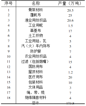 我國(guó)2000年產(chǎn)業(yè)用紡織品的分類產(chǎn)品及產(chǎn)量如下所示。