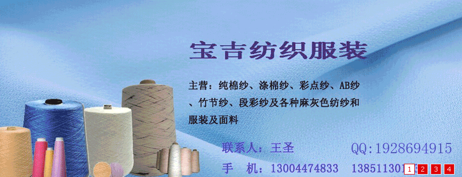 寶吉棉紡紗廠生產(chǎn)經(jīng)營(yíng):全棉紗、全滌紗、滌棉紗、麻灰紗、色紡紗;AB紗、本白AB紗、麻灰AB紗、彩色AB紗,AB竹節(jié)紗、AB麻灰色紡竹節(jié)紗;包芯紗、彈力紗、麻棉紗、亞麻紗、苧麻紗、麻滌紗,多彩紗、段彩紗、云班紗,彩點(diǎn)紗、彩色點(diǎn)子紗線、全棉彩色點(diǎn)子紗、滌棉彩色點(diǎn)子紗、全滌彩色點(diǎn)子紗、棉晴點(diǎn)子紗、滌晴點(diǎn)子紗、螢光點(diǎn)子紗,竹節(jié)紗、全棉竹節(jié)紗、全滌竹節(jié)紗、滌棉竹節(jié)紗、全晴紗、全晴麻灰色紗、染色紗線、天然色紗線等等紗線。 面料廠有:針織布類(汗布、棉毛布、毛圈、絨布等等)梳織布類(坯布、彩條、色織等等)服裝廠有:針織類(汗衫、棉毛衫、運(yùn)動(dòng)服、校服、內(nèi)衣、內(nèi)褲、保暖內(nèi)衣等等) 梳織服裝類(襯衫、夾克衫、羽絨服、褲子等等)。支持網(wǎng)上淘寶等等客戶的小訂單生產(chǎn)加工。