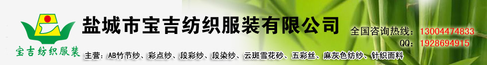 鹽城市寶吉紡織服裝有限公司:是2007年4月份由棉紗廠和面料廠及服裝廠重組的紡織服裝專業(yè)企業(yè)。主要生產(chǎn)各種棉紗、面料和服裝。 本單位下屬有專業(yè)生產(chǎn)麻灰紗的色紡紗廠---18萬5千紗錠;專業(yè)生產(chǎn)純棉紗的棉紡紗廠---20萬紗錠;另外還有專業(yè)的針織面料織造廠和寶吉服裝分廠。