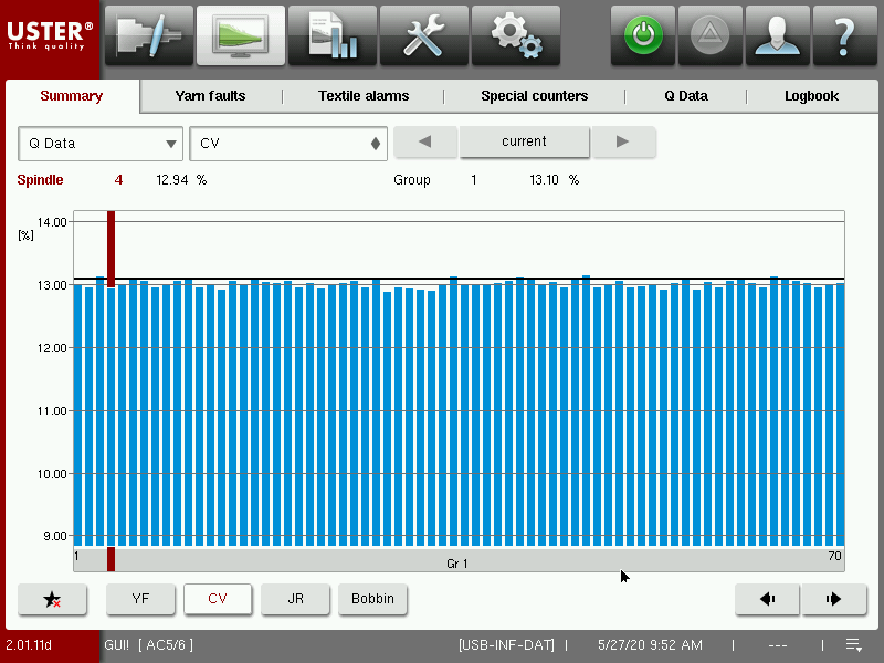 備注 一致性好,條干均勻,條干13點幾,每個柱狀圖都是單錠條干,為萬米數(shù)據(jù)累計。強力230。uster、長嶺長期合作研究企業(yè)
