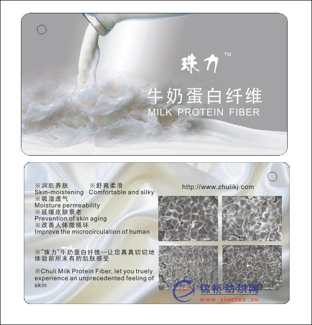 珠力牛奶蛋白纖維是紡織領(lǐng)域內(nèi)一種新型的功能性纖維,是以牛乳作為基礎(chǔ)原料,經(jīng)過脫水、脫油、脫脂、分離、提純等工藝制成乳酪蛋白,采用高科技手段,通過先進的紡絲工藝在紡絲時與纖維素纖維共混,制成的牛奶蛋白纖維,我公司擁有牛奶蛋白纖維的自主知識產(chǎn)權(quán)。