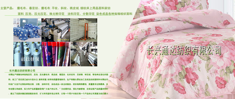 長期生產(chǎn)銷售各種規(guī)格壓花. 壓泡. 壓光磨毛布. 桃皮絨. 春亞紡. 化纖坯布. 交織棉. 磚石絨. 等各種全滌化纖面料。我工廠設在浙江省長興縣水口.擁有完整.科學的質(zhì)量管理體系。生產(chǎn)銷售從原絲加工至成品紡織面料和長期合作印染廠以至于達到各種珠光粉. 分散. 涂料印花. 染色成品一條龍的服務,把價格降到*低. 質(zhì)量要求達到*高。多年經(jīng)營以來誠信、實力和產(chǎn)品質(zhì)量都獲得廣大客戶的認可。”為經(jīng)營宗旨,強化內(nèi)部管理. 在保證新產(chǎn)品質(zhì)量的同時,建立了優(yōu)質(zhì)的售后跟蹤服務體系. 擴大和鞏固市場占有率,以每一個用戶對我們每一個產(chǎn)品的認可滿意為我們*大心愿。