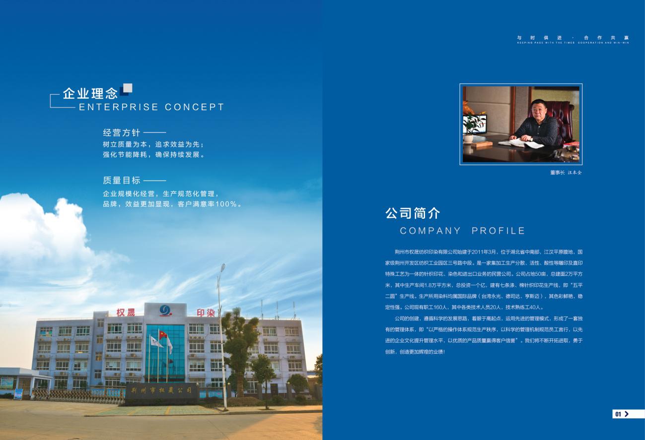 荊州市權(quán)晟紡織印染有限公司始建于2011年3月,位于湖北省中南部,江漢平原腹地,國家級荊州開發(fā)區(qū)紡織工業(yè)園區(qū)三號路中段。是一家集加工生產(chǎn)分散、活性、酸性等雕印及直印特殊工藝為一體的針織印花、染色和進出口業(yè)務(wù)的民營公司。公司占地50畝,總建面2萬平方米,其中生產(chǎn)車間1.8萬平方米,總投資一個億,建有七條滌、棉針織印花生產(chǎn)線,即“五平二圓”生產(chǎn)線。生產(chǎn)所用染料均屬國際品牌(臺灣永光、德司達、亨斯邁),其色彩鮮艷,穩(wěn)定性強。公司現(xiàn)有職工160人,其中各類技術(shù)人員20人,技術(shù)熟練工40人。 公司的創(chuàng)建,遵循科學的發(fā)展思路,著眼于高起點,運用先進的管理模式,形成了一套獨有的管理體系,即“以嚴格的操作體系規(guī)范生產(chǎn)秩序,以科學的管理規(guī)范員工言行,以先進的企業(yè)文化提升管理書評,以優(yōu)質(zhì)的產(chǎn)品質(zhì)量贏得客戶信譽”。我們將不斷開拓進取,勇于創(chuàng)新,創(chuàng)造更加輝煌的業(yè)績!