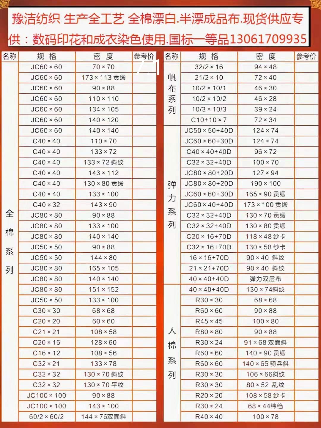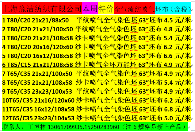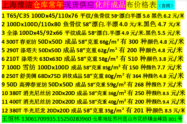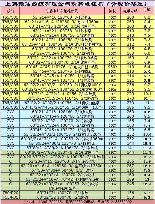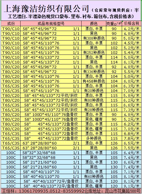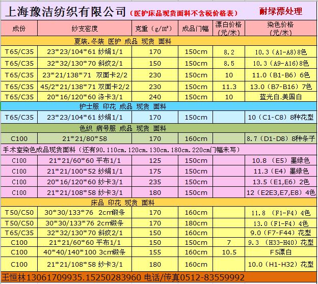 公司技術(shù)力量雄厚,產(chǎn)品質(zhì)量穩(wěn)定。積極致力于產(chǎn)業(yè)升級。產(chǎn)品方向立足于工裝面料的研發(fā)和生產(chǎn),坯布品種包括:滌棉平布、滌棉紗卡、滌棉線卡、滌棉府綢;全棉府綢、全棉紗卡、全棉線卡、全棉帆布、全棉彈力主要銷往山東、江蘇、浙江、四川、湖南等地。特別是本公司在上海設(shè)有大型倉庫,現(xiàn)貨供應(yīng)品種有四大系列:(1)工裝面料系列。(2)襯衫面料系列(3)各種規(guī)格全工藝漂白.半漂布成品布系列。(4)滌棉口袋布系列:58"T80/C20 45X45/110X76、 96X72漂白.半漂.黑色(有300多種顏色)口袋布。為國內(nèi)各大知名品牌的工裝企業(yè)和服裝出口企業(yè)長期提供面料。