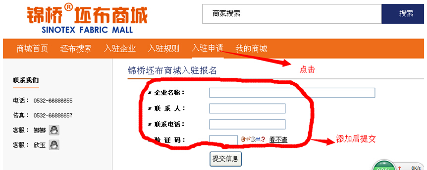 點(diǎn)擊錦橋坯布商城的“入駐申請(qǐng)”,按如下要求或提示,添加“入駐報(bào)名”的相關(guān)內(nèi)容,添加完成后提交。