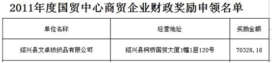 近日,紹興縣政府獎勵紡織企業(yè)名單公告出爐,我網高級會員“紹興縣文卓紡織品有限公司”以優(yōu)異經營成績獲得總獎勵第三名。
