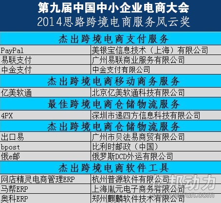 【億邦動力網訊】4月3日,第九屆中國中小企業(yè)電子商務大會暨2014中國(河南)跨境貿易電子商務峰會在鄭州國際會展中心隆重召開,年會現(xiàn)場舉行盛大的頒獎典禮。頒布2013年度行業(yè)電子商務網站單項獎、2013年度中國B2B行業(yè)網站影響力獎、2013中小企業(yè)電子商務應用20強和2014思路跨境電商服務風云獎。 2013年度行業(yè)電子商務網站單項獎