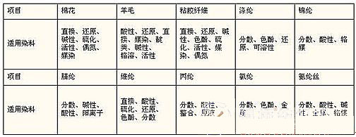 粘纖的這一特性滿足了人們追求國(guó)際流行色的需求。無(wú)論是染整的物理處理和化學(xué)處理,還是漂、染、印和整理,各種纖維的染料對(duì)粘纖都適合,下面是各種纖維的適用染料表: